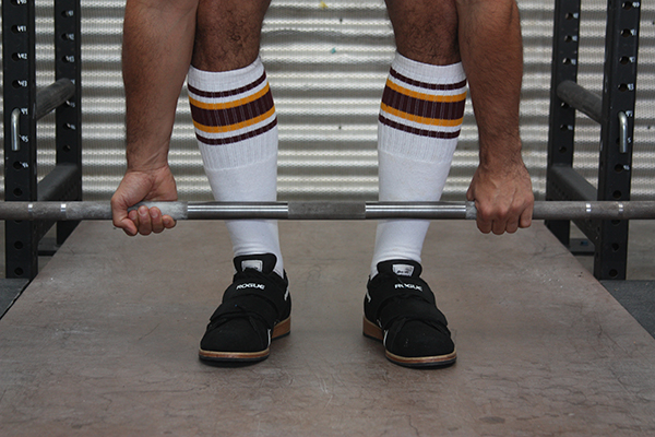 For novice lifters, lifting without shoes should come much later in the development of the athlete. Start by deadlifting in your lifting shoes. The design makes them safe and effective for all barbell training, and shoes will keep your feet covered and protected while you train. At some point, however, you will have enough reps under your belt that maybe you will notice the difference half-an-inch makes to your setup.