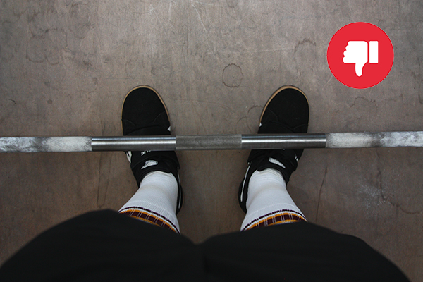 Don’t stand so close to the bar that your shins touch it. This will 1) result in the bar not being over your midfoot, and 2) throw off the rest of your deadlift setup.