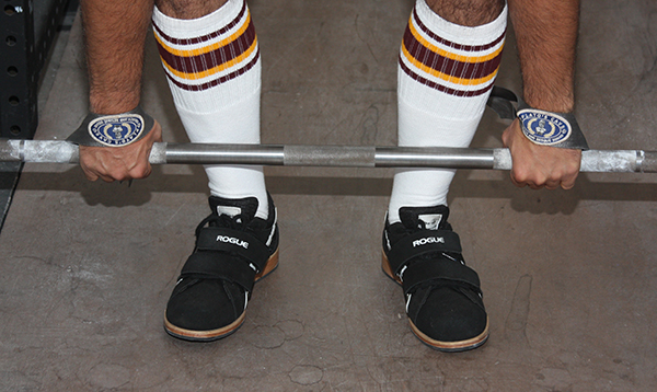The downside of lifting without shoes is you do lose some traction between you and the floor. This is especially true if you’re lifting in socks on a hardwood floor. That can get slippery. To get the range of motion benefit of deadlifting without shoes but with added traction, some powerlifters perform the exercise in deadlift slippers. These look like ballet slippers, and have a nice leather sole that provides traction between you and the floor.