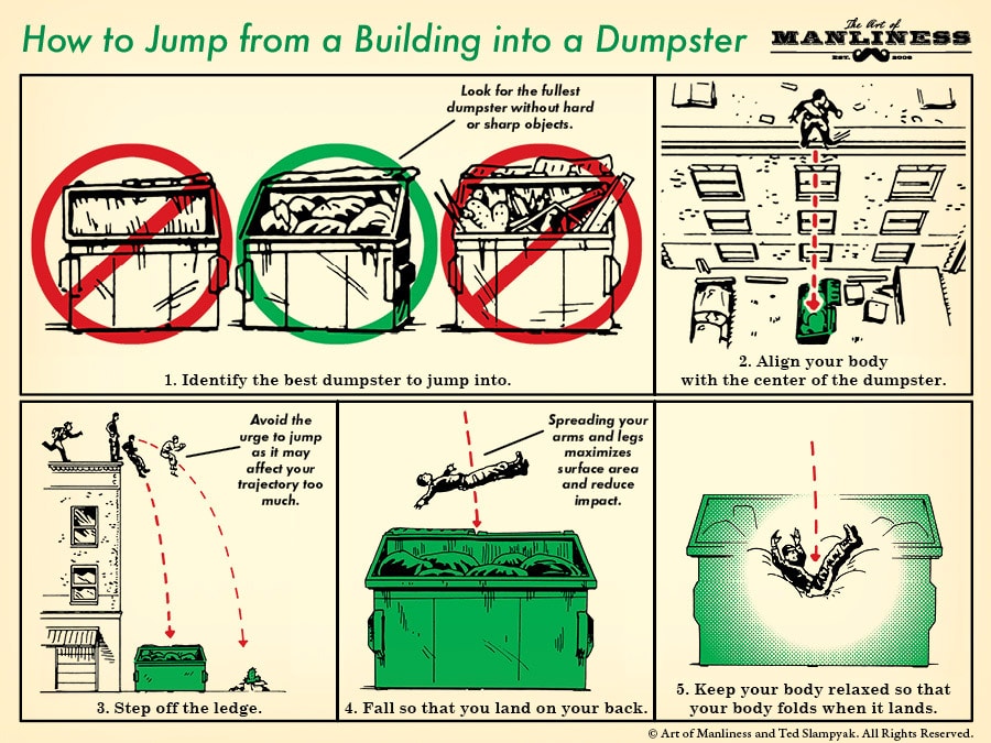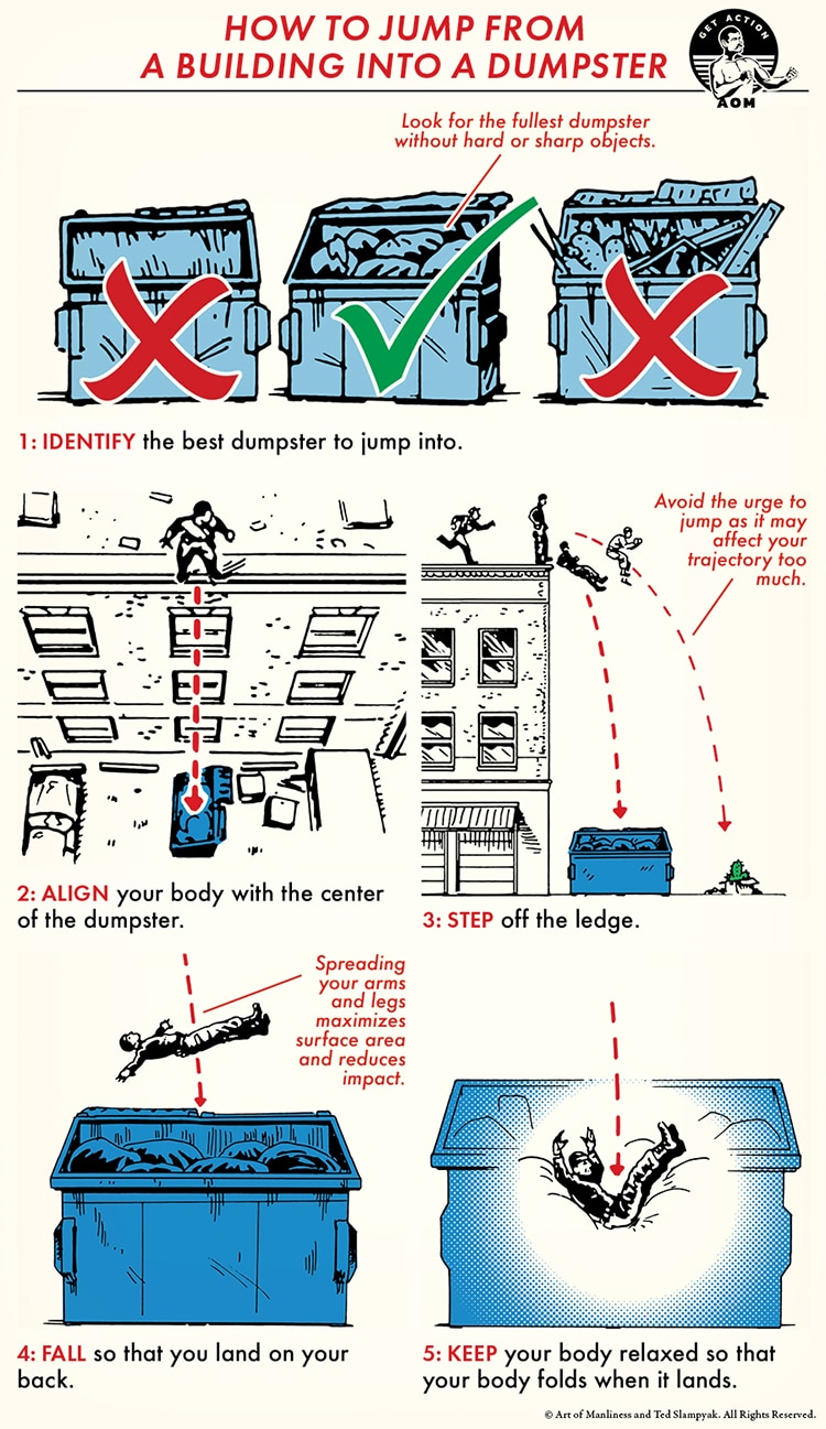 Burning buildings, daring escapes, or a new career in stunt work may require you to make the leap from the top of a building into a well-placed dumpster. Without question, this is a last resort action and shouldn’t be attempted unless absolutely necessary. But, if you find yourself with the need to make the ultimate dumpster dive, these tips can help you reduce the chances of serious injury.