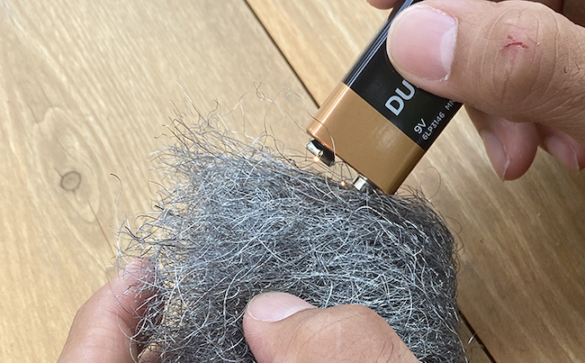 Rub the battery on the steel wool. Hold the steel wool in one hand and the battery in the other. Any battery will do, but 9-volt batteries work best. Rub the side of the battery with the “contacts” on the wool. The wool will begin to glow and burn. Gently blow on it.