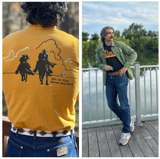 Get a cool belt. Wearing a cool belt gives you an excuse to tuck in your t-shirt: you’re tucking in your tee so people can see your rad belt. My go-to belt when I tuck in my t-shirt is the Cowboy belt from Zilker (that’s what I’m sporting in the left pic above). I also like to rock a thicker, more traditional leather belt, which has a cool Thunderbird belt buckle that I found on eBay (right photo). Besides adding some visual interest to your tucked-in t-shirt fit, a belt also accentuates your waist a bit more, enhancing your v-shaped silhouette.