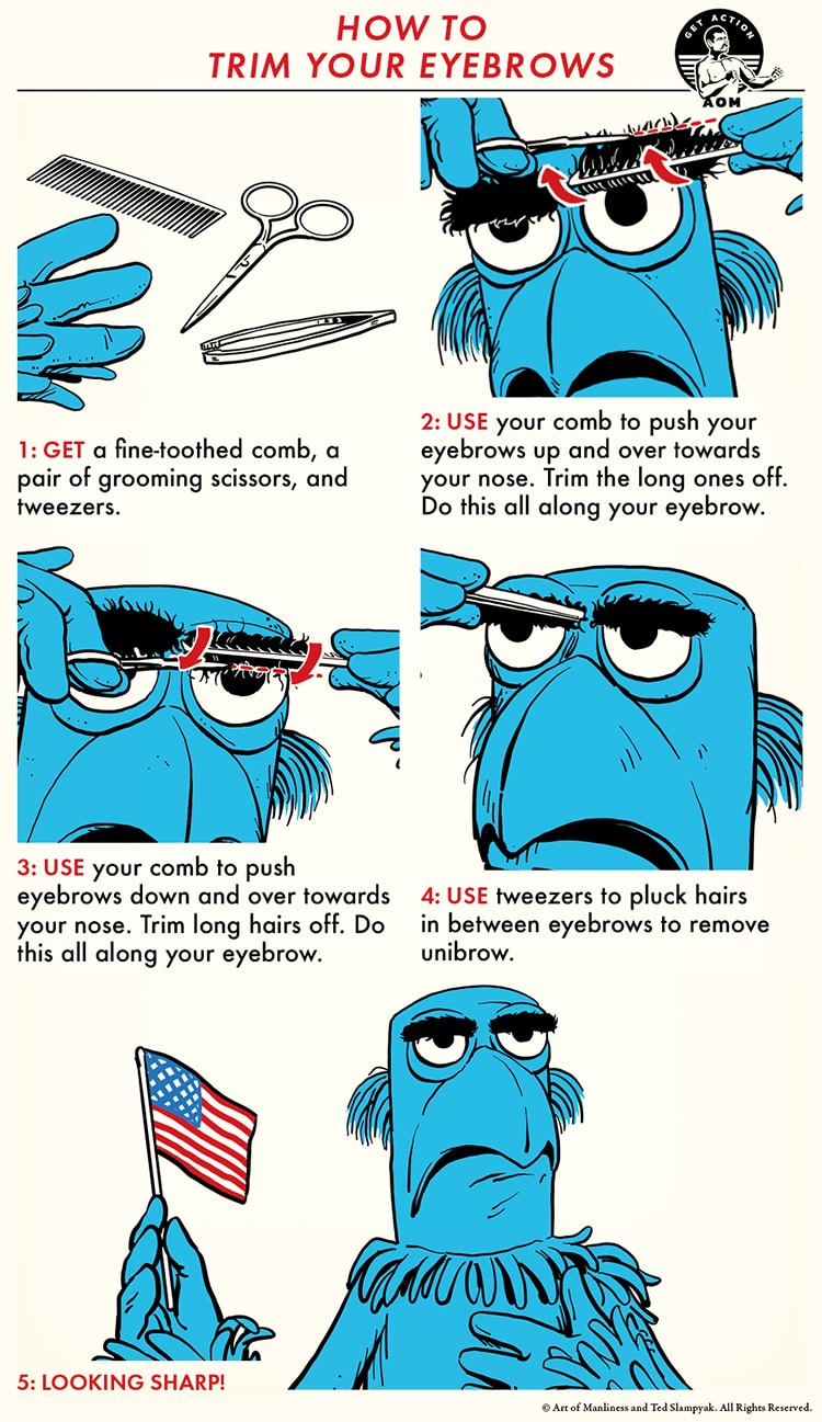 If your eyebrows could similarly use a trim, here to show us how its done is none other than Sam the Eagle. It was only proper that he’d be our guide in the way of distinguished, dignified, well-groomed brows.