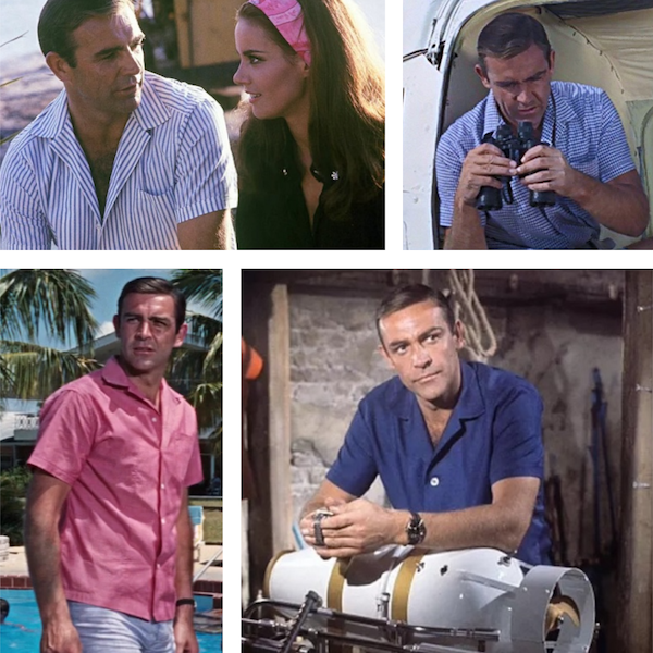 Sean Connery’s James Bond regularly wore camp collar shirts in a variety of colors and patterns.