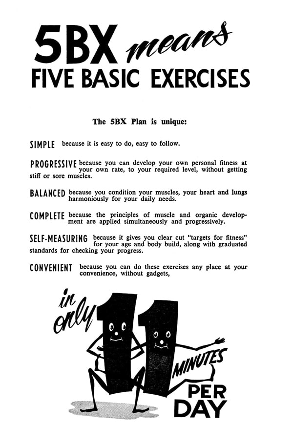 The 5BX plan (Five Basic Exercises) was born out of a particular need: a third of the RCAF’s pilots were deemed unfit to fly and needed a workout program that 1) could be done without any specialized equipment, as the pilots were often stationed at remote bases without access to standard gyms, and 2) could fit into airmen’s busy schedules.