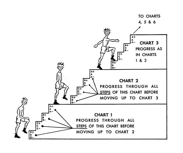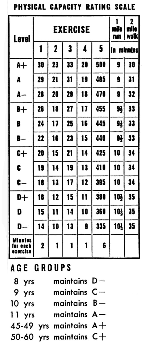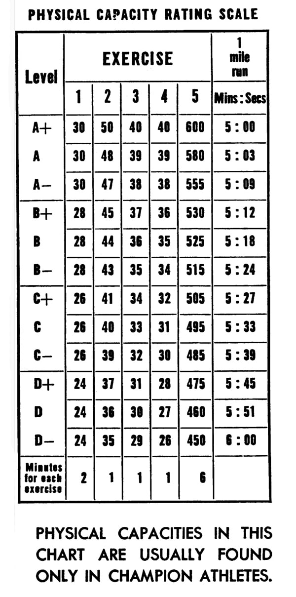 Start at the lowest Physical Capacity Level of Chart 1 (D-). Repeat each exercise in the allotted time or do the 5 exercises in 11 minutes. Move upward on the same chart to the next level (D) only after you can complete all the required movements at your present level within 11 minutes. Continue to progress upward in this manner until you can complete all the required movements at level A+ within 11 minutes. Now start at the bottom of Chart 2 (D-), and continue in this fashion upwards through the levels, and from chart to chart until you reach the level for your age group.