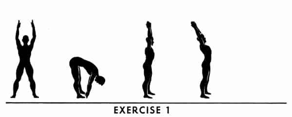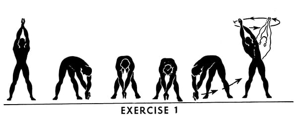 Let us see how this principle applies to exercise No. 1, which requires you to touch the floor. You should not force yourself to do it on the first attempt, but rather start by pushing down very gently and slowly as far as you can without undue strain — then on each succeeding try push down a little harder, and, at the same time, do the exercise a little faster so that by the end of two minutes you are touching the floor and moving at the necessary speed. All the exercises can be performed in this manner.