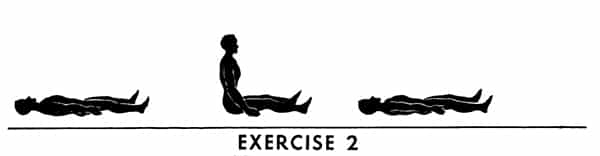 Back lying, feet 6” apart, arms clasped behind head. Allow knees to bend slightly. Sit up to vertical position, keep feet on floor, hook feet under chair, etc., only if necessary.