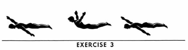 Front lying, arms extended over head. Raise arms, head, chest, and both legs as high as possible then press back once. Keep legs and arms straight — chest and both thighs completely off floor.