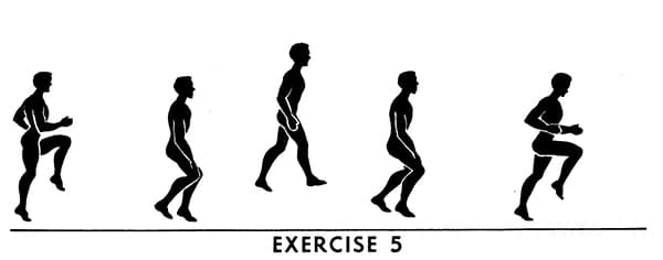 - Running in place, interspersed with various jumps (can be substituted for an actual run or walk)